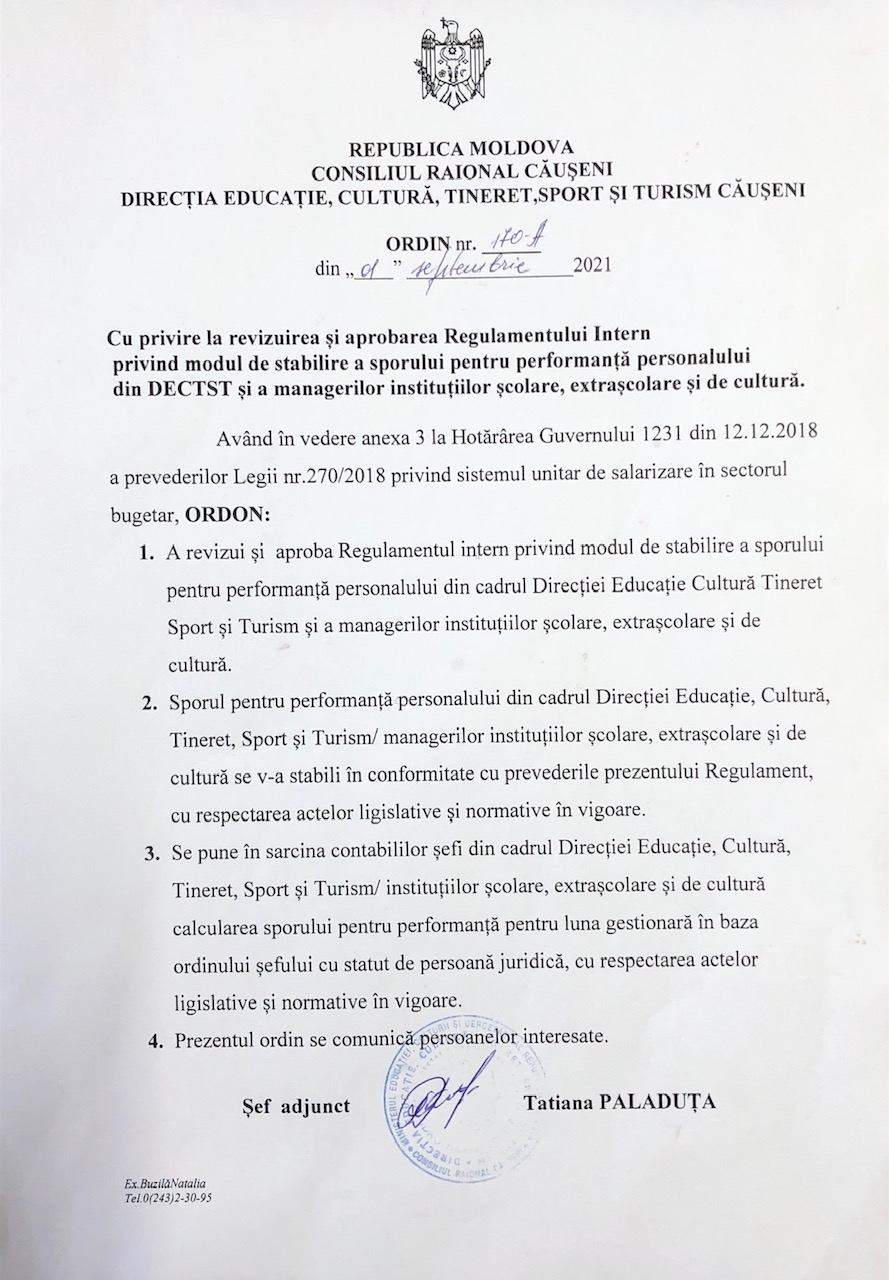 Ordin cu privire la revizuirea și aproberea Regulamentului Intern privind modul de stabilire a sporului pentru performanță personalului din DECTST și a managerilor instituțiilor școlare, extrașcolare și de cultură. (inclusiv Anexa)