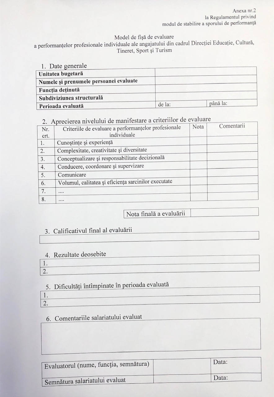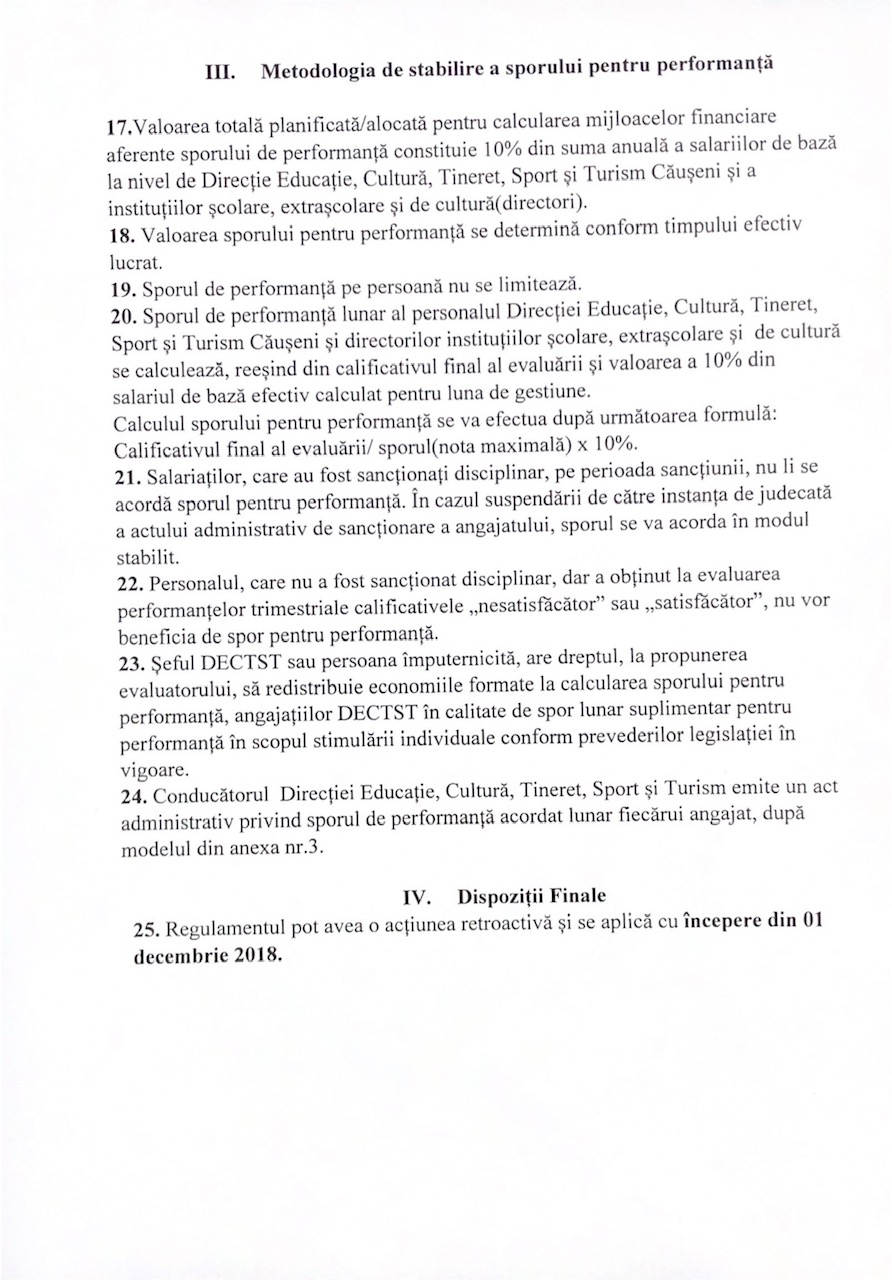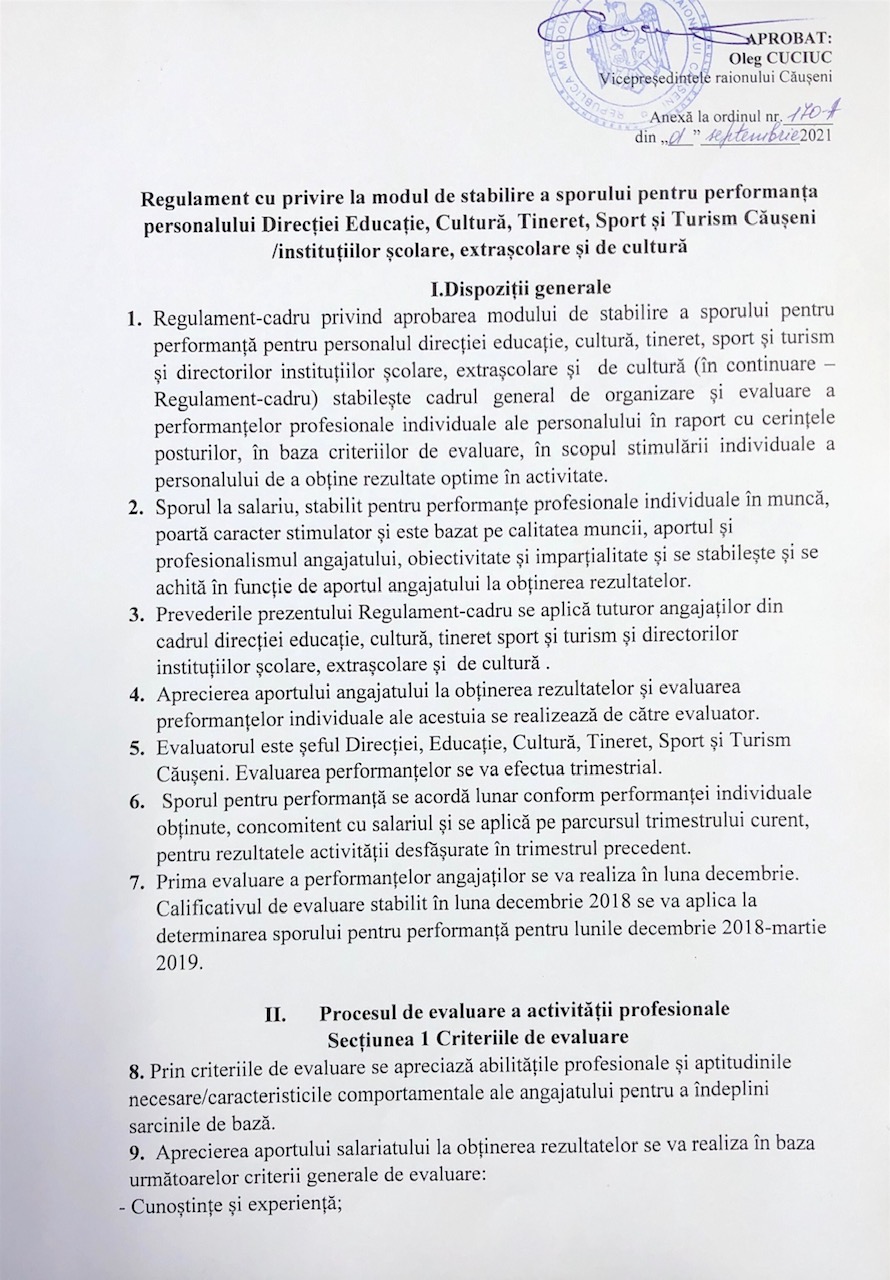 Regulamentul cu privire la modul de stabilire a sporului pentru performanța personalului direcției educație, cultură, tineret, sport și turism Căușeni/ instituțiilor școlare, extrașcolare și de cultură